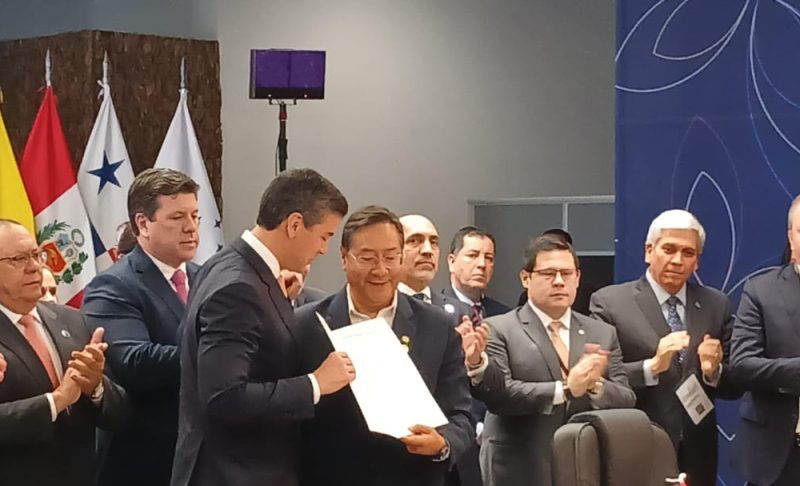 Asunción del Paraguay: Momento en el que el Presidente del Estado Plurinacional de Bolivia, Luis Arce Catacora deposita en manos del Presidente Pro Tempore, Santiago Peña, el Instrumento de Ratificación del Protocolo de Adhesión de Bolivia al Mercosur.
