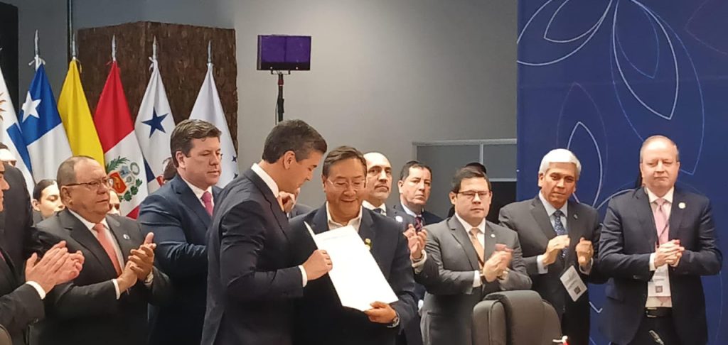Asunción del Paraguay: Momento en el que el Presidente del Estado Plurinacional de Bolivia, Luis Arce Catacora deposita en manos del Presidente …