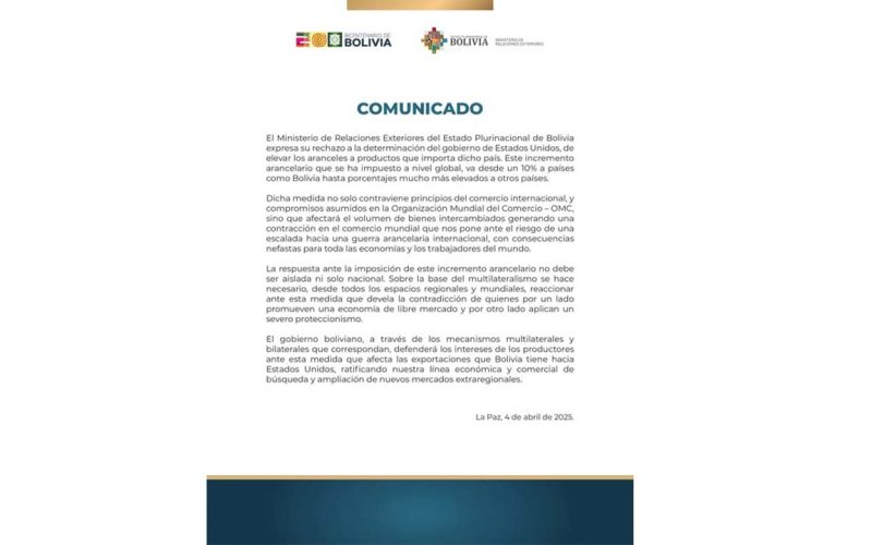 El Ministerio de Relaciones Exteriores del Estado Plurinacional de Bolivia expresa su rechazo a la determinación del gobierno de Estados Unidos, de elevar los aranceles a productos que importa dicho país. Este incremento arancelario que se ha impuesto a nivel global, va desde un 10% a países como Bolivia hasta porcentajes mucho más elevados a otros países.