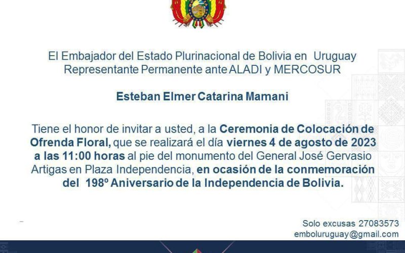 INVITACIÓN: Acto de Conmemoración del 198 Aniversario de la Independencia de Bolivia