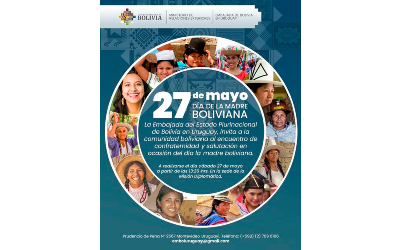 La Embajada del Estado Plurinacional de Bolivia en la República Oriental del Uruguay tiene el agrado de invitar a toda la comunidad boliviana residente en Uruguay, al encuentro de confraternización y salutación en ocasión del día de la Madre boliviana.