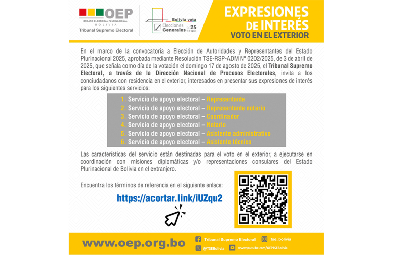 La Embajada del Estado Plurinacional de Bolivia en la República Oriental del Uruguay, tiene a bien comunicar que El Tribunal Supremo Electoral, a través de la Dirección Nacional de Procesos Electorales, invita a los conciudadanos con residencia en el exterior a presentar sus expresiones de interés en los siguientes servicios.